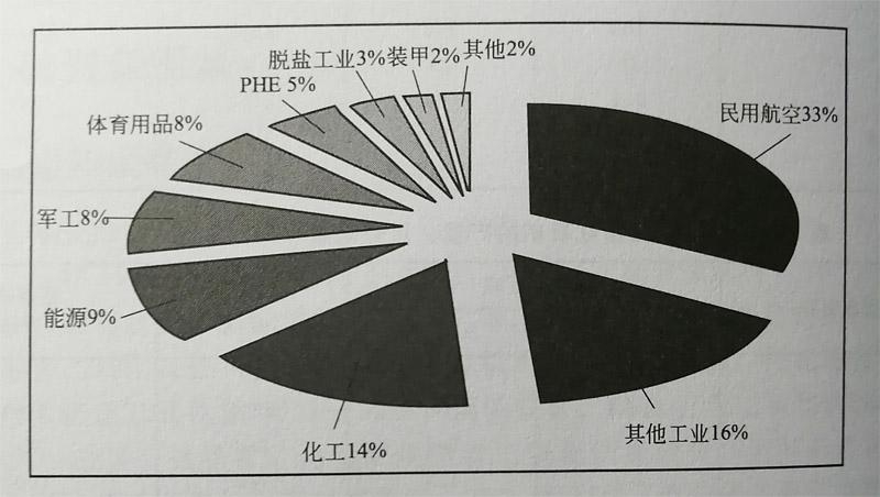 鈦合金的應用領域廣泛。圖1-2顯示了20世紀北美、西歐鈦在各領域的使用量,其中民用航空領域鈦的使用量 最大,占33%,其次為化工、能源、軍工和體育用品,少量的部分用于PHE、脫鹽工業和裝甲等。