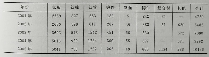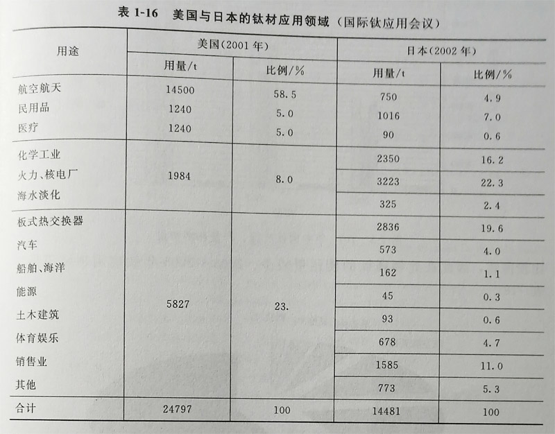 美國與日本的鈦加工材用途比較見表1-16,數據來源于上海國際鈦會議(從表1-16中可看出美國2001年鈦加工 材用量為24979t,其中宇航用量為14500t,占58.5%,這說明美國以航空工業為主。日本2002年鈦加工材用量為 14481t,其中宇航用量為705t,只占4.9%,日本是以民用工業為主。俄羅斯2000年宇航應用為45%~48%,船舶應 用為7%~12%,石油、化工和其他工業應用為12%~18%,出口為20%~30%,說明俄羅斯以宇航和船舶工業為主 出口量也較大近5年來,中國鈦材產量見表117(根據中國鈦協會統計),2001年為4720:;2002年為5482t;200年 為7080t;2004年為9292t;2005年為10136t鈦材產量增加近一倍(近10000,日前已成為繼美國、俄羅斯、日本 之后,躋 身世界第四大鈦工業國。