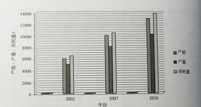 中國鈦工業協會統計了2002年和2007年中國鈦的產能、產量和消耗量,如圖1-3所示。2007年的產能、產量和 消耗量分別為100018000、10500t,而2002年的產能、產量和消耗量分別為6000、5000t、6500t,年增長率約 為9%按此增長率計算2010年中國鈦的產能、產量和消耗量分別為130001、100014000,將居世界第三位 。