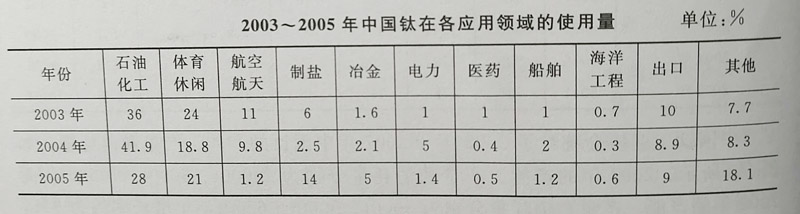 2003~2005年中國鈦在各應用領城的使用量