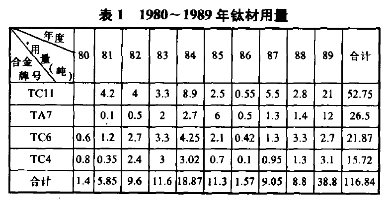 為適應鈦鍛件的開發,工廠進行了相應的技術改造,建立了具有一定能力鈦鍛件生產線,并形成了批量生產,為我部渦噴系列的發動機提供了除鈦葉片以外的整機鈦合金鍛件,為一些飛機提供了大型鈦合金結構件。十年來,我廠生產的鈦鍛件為520批次,鈦材用量116.8噸,見表1。尤其是TC11鈦鍛件的開發,幾年來共提供1170件壓氣機盤模鍛件,創產值1000余萬元;TA7鈦鍛件的開發,自1982年以來,生產550件機匣殼體環形件及模鍛件,創產值400余萬元。回顧鈦合金鍛件開發的十年,不僅對航空產品更新換代產生了引人矚目的作用,而且在提高企業經濟效益方面收到了明顯的效果,而產品開發的本身則是依賴技術進步,依靠廠、所一體化的作用,依靠技術改造及產品的創優。