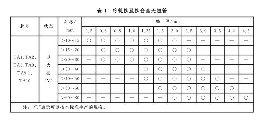 3.1.1.1 冷軋鈦及鈦合金無縫管的牌號、狀態和規格應符合表1的規定。