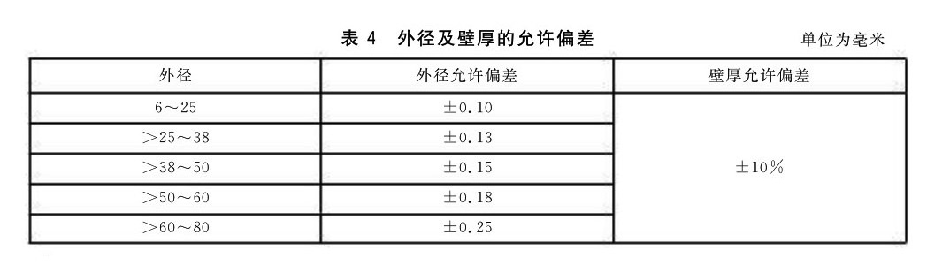 3.2.1 管材外徑及璧厚的允許偏差應符合表4的規定,管材壁厚的允許偏差不適用于焊接管的焊縫處。