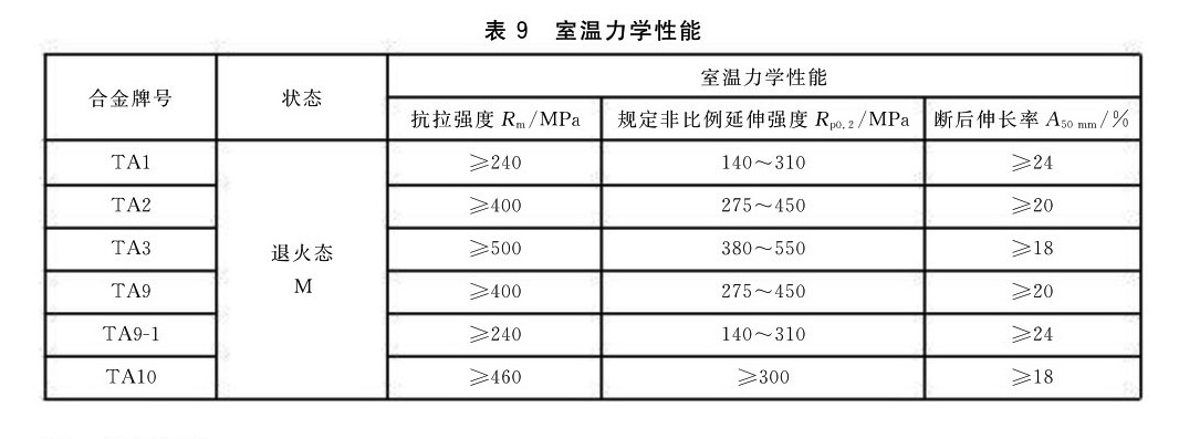 3.4.1 管材在供應狀態下的室溫力學性能應符合表9的規定,規定非比例廷伸強度R,在需方要求并在合同中注明時方予測試。