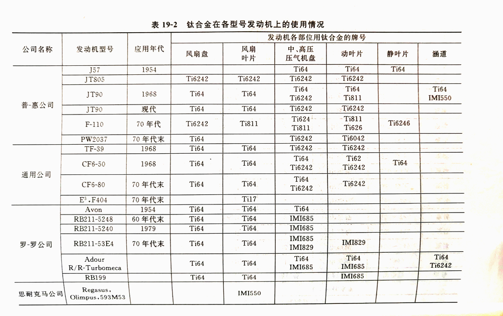 發動機是飛機的心臟。發動機的風扇、高壓壓氣機盤件和葉片等轉動部件,不僅要承受很大的應力,而且要有良好的耐熱性,即要求鈦在300~650℃溫度下具有抗高溫強度、抗蠕變性和抗氧化的性能。歐美各型號發動機的鈦合金使用情況見下表。