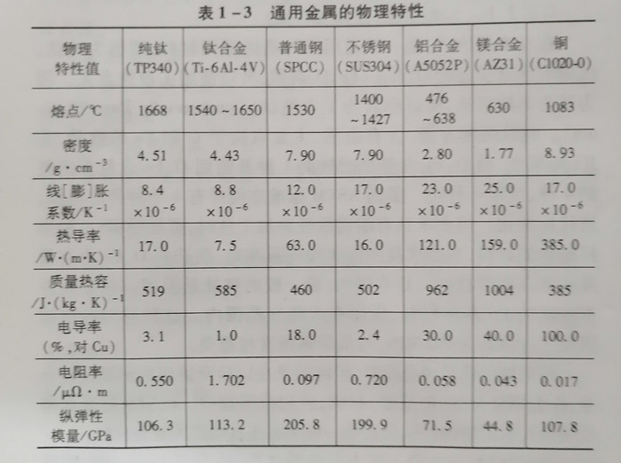 表1-3通用金屬的物理特性