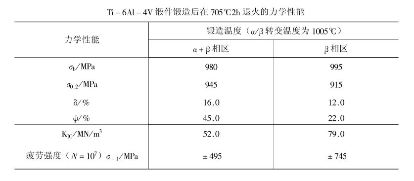 a+β鈦合金的力學(xué)性能與組織間的關(guān)系也較復(fù)雜。合金的抗拉強(qiáng)度對退火組織和鍛造溫度不甚敏感,見下表。