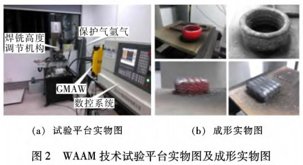 WAAM主要包括熔化極惰性氣體保護焊(Metalinert gas welding,MIG)、鎢極惰性氣體保護焊(Tung—sten inert gas welding,TIG)、等離子弧(Plasma arc,PA)、冷金屬過渡(Cold metal transfer,CMT)技術四種方式,TIG電弧增材制造技術是在鎢極氬弧焊接方法的基礎上改良而形成的一種技術,主要的研究對象有鋁合金、鈦合金、不銹鋼;MIG電弧增材制造技術主要采用直接熔絲的方法進行堆焊,此項技術大多數主要研究其成形工藝和力學性能,主要研究對象有鋁合金、鈦合金;PA電弧增材制造技術是一種高效率的焊接熱源;CMT技術則是一種全新的冷金屬過渡技術,其優點為熱輸入低,可以避免熔滴穿透,有利于熔滴過渡和良好的冶金連接。圖2為華中科技大學電弧增材制造技術的試驗平臺實物圖及成形實物圖。