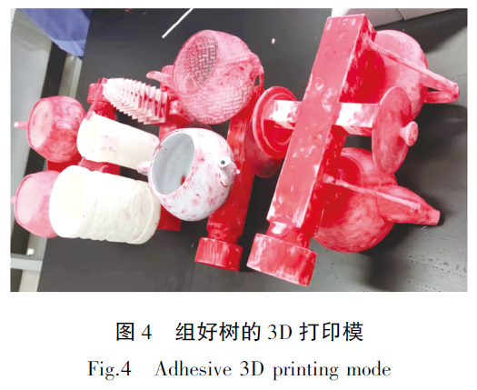 根據產品尺寸和結構選擇合適的組樹方式,將檢查合格的3D打印模按照工藝要求組焊到澆注系統上。為了能牢固的組裝模型各個部件,我們采用熱熔膠槍對各個部件進行粘接,模組焊合處應飽滿、圓滑、無虛焊和焊瘤。圖4 為粘接好的模型。
