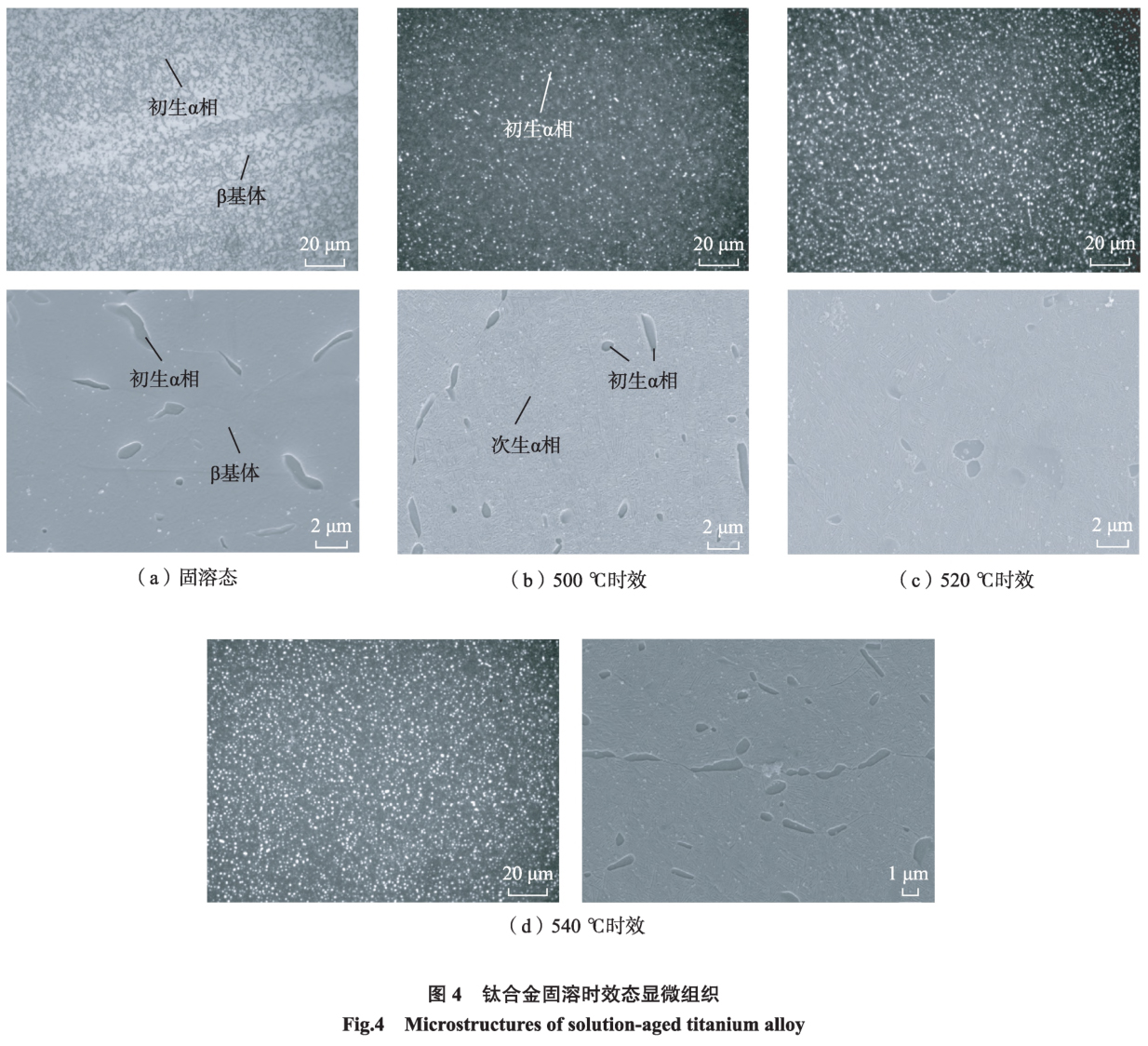 鈦合金經固溶時效處理后的顯微組織如圖4所示。可知,該合金在相變點以下進行固溶處理后,其組織為α+β雙相組織,在合金β基體上彌散分布著細小的初生α相顆粒,初生α相形態為等軸和短棒狀,其中,等軸初生α相含量相對較多。時效態的顯微組織由微米尺度的初生α相顆粒和彌散分布著大量納米尺度的次生α相的β轉變組織組成,呈等軸狀、短棒狀的初生α相在基體晶粒界面和內部均有分布,同時在β基體相內彌散分布著大量的針狀或片層次生α相。
