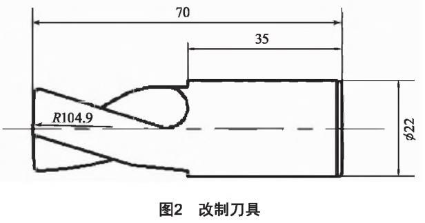 按加工鈦合金結構件翼面的弧面要求,翼面弧面與鈦合金結構件外殼弧面相吻合(圖1,R104.9)。傳統加工手段為通用的臥式鎮床,但生產效率偏低(每日僅能加工4~5件),難以滿足目標基本生產需求[4]。本文提出了一種新的加工手段,選擇銑削方法加工弧面R104.9,以銑代鏜,最終加工效率提高了5倍以上。而該方法需要對銑刀做出優化改進,如圖2所示,同時需要對工藝路線進行修正。