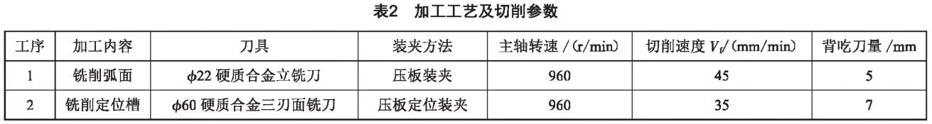 基本設計要求為:強度、剛度和穩定性均需要提升,以保證夾具系統在加工過程中可以承受較大的力[6];進一步增大夾具系統的安裝面,以周邊接觸作為最佳接觸選擇。適用于銑床的夾具為保持定位,會選取定位鍵與自身平臺具有特定形狀的槽進行配合。定向鍵與夾具體配合多采用H7/h6,定位鍵與特定形狀槽(通常為T形槽)配合的部分預留出一定部分的余量進行修 配,以保證最終的安裝精度,或通過在夾具正常使用時,使定位鍵的某一面與平臺特定形狀槽接觸,抵消安裝間隙。銑床夾具通常配有特殊設計的耳座,以螺栓連接的方式保證整個加工系統的緊密連接氏〕。加工工藝及切削參數如表2所示。