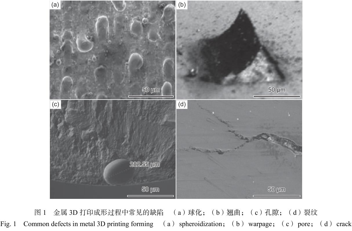 采用3D打印技術制備鈦合金,成功克服了使用傳統方法制備鈦合金結構件時,所面臨的費用高、材料浪費嚴重、加工工藝復雜,以及后續加工困難等不利因素,但采用3D打印技術成形鈦合金零件時,由于粉末/絲材特殊的加工性能,或者工藝參數選擇不當,工件容易出現球化、裂紋、孔隙以及翹曲變形等缺陷。如圖 1 所示,嚴重影響鈦合金的機械性能和成形精度,阻礙了鈦合金3D打印技術的發展。另外,缺陷無損檢測是3D打印件能否實現廣泛應用的基礎,也是影響3D打印技術進一步發展的決定因素。目前,國內外對3D打印件缺陷進行無損檢測的方法主要有[20-22]:滲透檢測、X 射線檢測、磁粉檢測和超聲檢測等。隨著3D打印件向結構大型化、復雜化和精細化方向發展,傳統的無損檢測方法已經不再適用于3D打印件的缺陷檢測和分析,新型的無損檢測技術工業 CT 檢測和激光超聲在線無損檢測相繼問世。Plessis 等[23]采用 CT 技術檢測3D打印成形的復雜鈦合金結構件,成功檢出了孔隙率僅為 0.005% 的微孔隙,這在采用常規無損檢測方法是幾乎不可能檢出的。國內一專利[24]發明了激光超聲無損檢測技術,利用激光激勵的超聲表面波幅的變化檢測3D打印過程中產生的缺陷,實現制造過程同步對零件進行檢測。