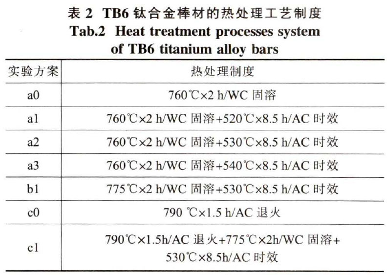 將TB6鈦合金棒材分別進行不同實驗方案的熱處理,研究熱處理后合金組織和性能的變化。表2為TB6鈦合金棒材的熱處理工藝制度。金相試樣腐蝕劑成分為10%草酸飽和溶液+3%氫氟酸+87%H,0(原子分數)。顯微組織觀察在OLYMPUS/PMG3型光學顯微鏡上進行;室溫拉伸性能測試采用INSTRON型電子萬能實驗機完成。