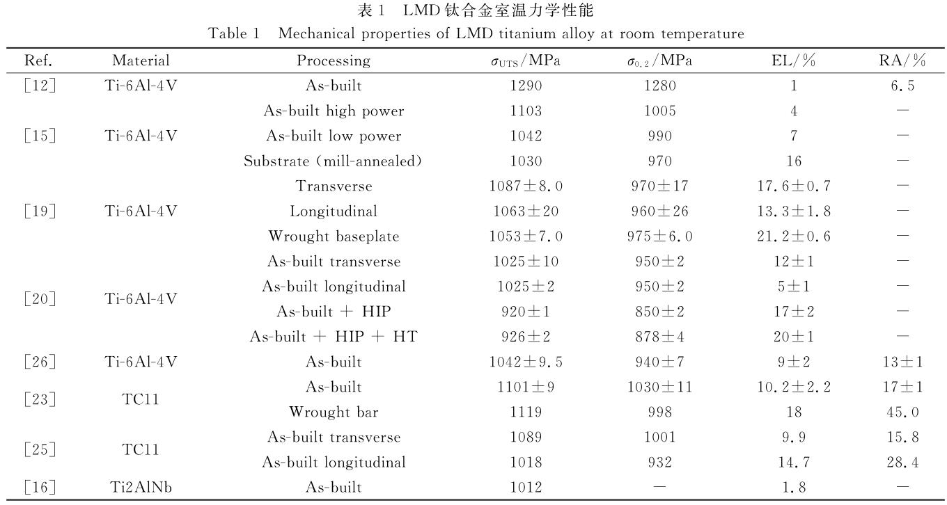 LMD主要參數(shù)包括激光功率、掃描速度、搭接率、單層厚度、送粉速率等,為了便于試驗分析,引入線能量并將其定義為激光功率與掃描速度的比值,單位為J/mm。LMD以千瓦級激光器為能量源,熔池溫度高,易形成粗大的晶粒,在制備Ti-22Al-25Nb過程中,顯微組織表現(xiàn)為細針狀魏氏體組織[16,17]。張霜銀等[18]研究表明線能量大于993J/mm時,晶粒呈現(xiàn)等軸晶形態(tài);搭接率為40%時,成形件未見熔合不良現(xiàn)象;單層厚度過小會造成重熔加深,導致層間組織粗大。LMD鈦合金組織具有外延生長的特性,易形成貫穿多個沉積層的柱狀晶粒,顯示出定向凝固特征。Carroll等[19]制備的“十”字型Ti-6Al-4V合金成形件,初生β相沿豎直方向生長為細長的柱狀晶粒,成形件具有力學各向異性,其中橫向伸長率明顯高于縱向伸長率。Qiu等[20,21]研究表明高激光功率和低送粉率能夠最大程度地減少Ti-6Al-4V合金的孔隙率,通過后續(xù)熱等靜壓處理能夠促使馬氏體α′相轉(zhuǎn)變?yōu)槠瑢訝?alpha;+β相,進而提高合金韌性、消除力學性能的各向異性。TC11鈦合金成形件沿垂直于激光抬升方向具有高強度和低塑性的力學性能;近β相鈦合金Ti-5Al-5Mo-5V-1Cr-1F的晶粒擁有3種形態(tài),分別為沉積層重疊區(qū)的大柱狀、頂部的小柱狀和底部的等軸狀[22-25]。表1列出不同牌號鈦合金LMD成形件的力學性能。