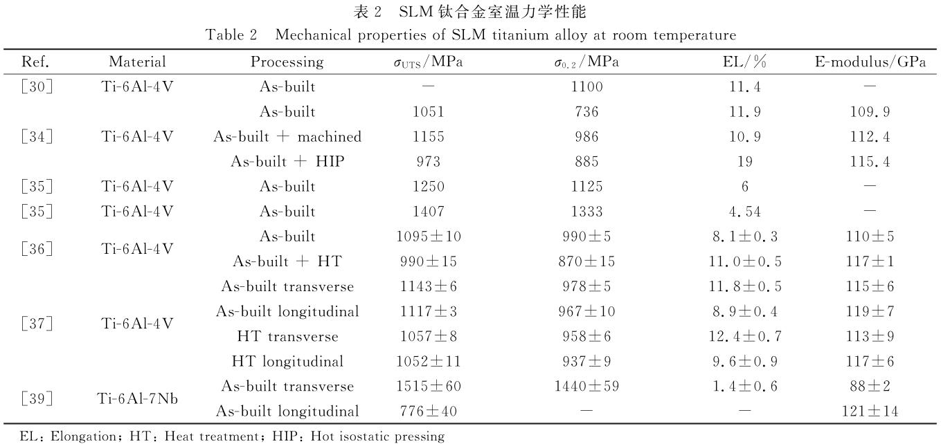SLM工藝參數(shù)包括激光功率P、掃描速度v、單層厚度t、掃描間距h、掃描策略等,引入綜合評定參數(shù)能量密度,單位為J/mm3。研究表明[29,30],低能量密度易在Ti-6Al-4V成形 件頂部出現(xiàn)大量氣孔和熔合不良點,顯微組織以片層狀α+β相為主;高能量密度易導致材料汽化而生成內(nèi)嵌孔,顯微組織以針狀馬氏體α′相為主。Thijs等[31]研究表明高能量密度促進鋁元素偏聚在TC4合金熔池邊界,從而增大α2-Ti3Al相含量。Yadroitsev等[32]利用CCD相機光學監(jiān)控系統(tǒng)觀測到增加激光功率、延長激光輻照時間均會提高熔池的最高溫度、幾何寬度和深度。此外,近年來學者將熱等靜壓技術(HIP)與SLM技術配套使用,有效降低SLM成形件的孔隙率。研究表明[33-38],通過HIP處理,能夠?qū)⒖紫堵蕪某练e態(tài)的0.501%降低為熱等靜壓態(tài)的0.012%,并能改善合金性能。圖2為激光選區(qū)熔化成形示意圖,表2列出了SLM鈦合金成形件力學性能。