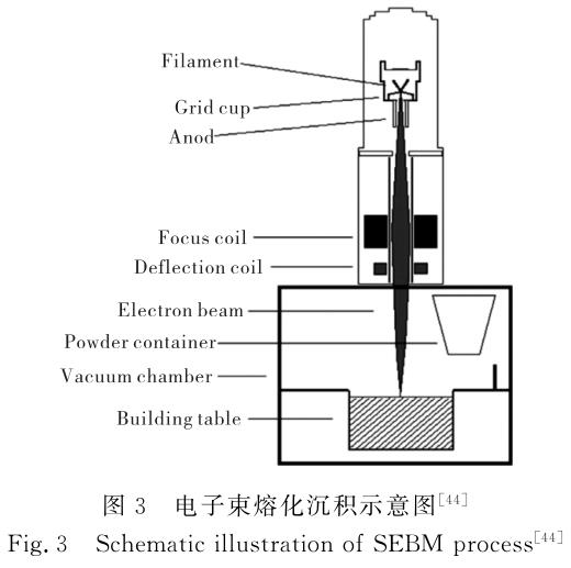 電子束選區(qū)熔化成形技術由瑞典ChalmersUniversityofTechnology與Arcam公司在20世紀90年代初期共同開發(fā),采用逐層鋪粉熔化的方式制備金屬零件,工藝流程與SLM 類似,區(qū)別在于SEBM以電子束替代激光作為能量源,制備過程處于10-3Pa以上的高真空環(huán)境。電子束能量源具有能量利用率高、作用深度大、金屬反射小、材料吸收率高等優(yōu)點, 成形效率明顯高于SLM工藝;高真空環(huán)境能夠最大程度地降低空氣中O、N等間隙元素對材料的污染。