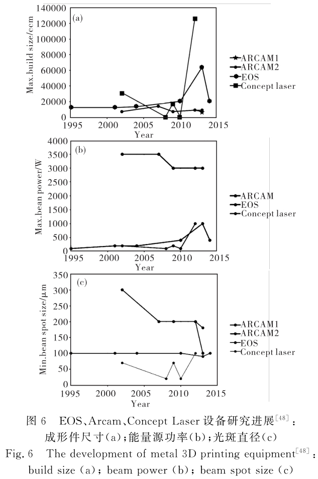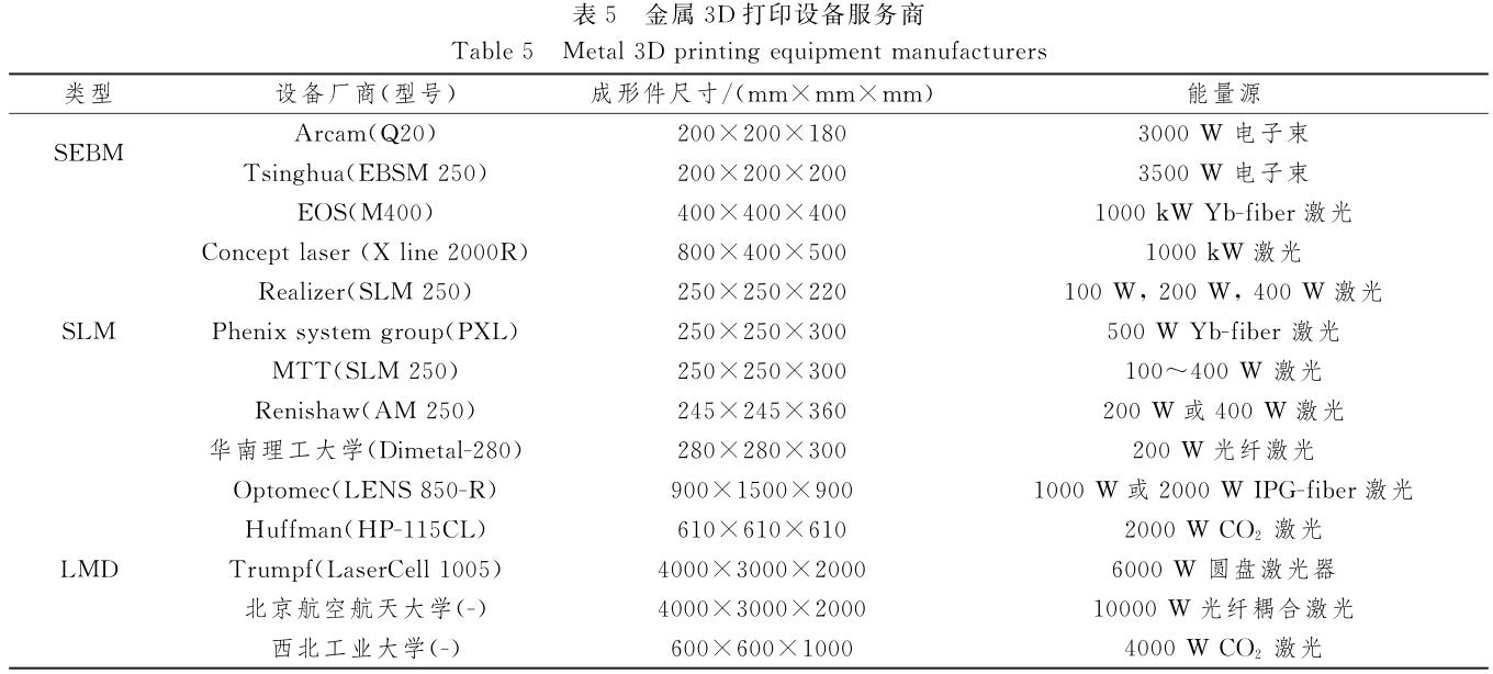 但是,SLM成形效率低、金屬粉末成本高昂是該工藝亟待解決的技術難點。SEBM設備能力介于LMD與SLM兩者之間,既有較好的表面質(zhì)量,又有較高的成形效率,是目前醫(yī)療領域、航空領域的主要制備技術,如圖5所示。表5列出了不同3D打印設備的成形件尺寸和能量源功率,可以看到,SLM和SEBM的設備能量源功率和成形件尺寸均小于LMD設備,因此,LMD具備打印大型成形件的能力。圖6為近年來金屬粉末3D打印設備研發(fā)進展情況,可以看到高功率能量源的研發(fā)不再是設備的主要關注點,反而大尺寸成形件、高精度光斑、恒定能量源是未來3D打印設備的主要發(fā)展趨勢。