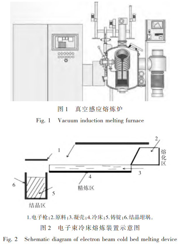 真空熔煉是一種重要的金屬制備方法,其基本原理為將金屬樣品放置于高真空或極低氣壓環(huán)境中,通過加熱使金屬熔化后再冷卻凝固,以獲得高純度、低氣體含量的金屬材料[6]。其核心在于利用真空環(huán)境,避免金屬與空氣中的氧、氮等雜質(zhì)發(fā)生反應(yīng),從而減少雜質(zhì)的混入。真空熔煉不僅需要高度純凈的工藝環(huán)境,還需精確控制溫度、壓力等參數(shù)[7],以確保金屬材料的純度和均勻性。