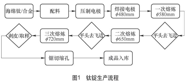 流程圖中φ580mm和φ650mm這兩種規(guī)格的鈦錠只平頭不剝皮,目的是去除飛邊、錠冠,為熔煉做準(zhǔn)備,在φ720mm成品鈦錠的頭、中、尾取屑樣和塊樣。