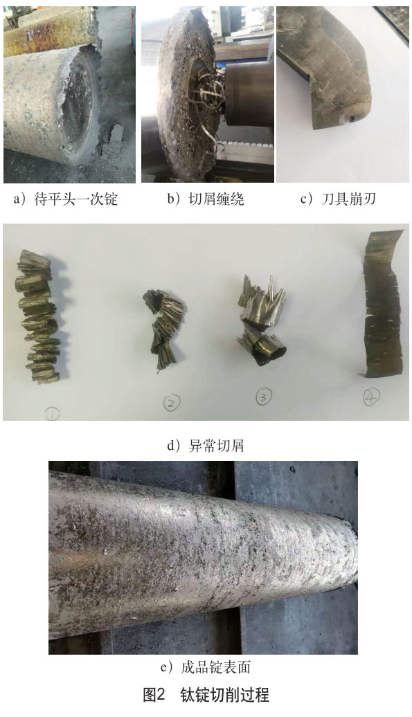 (2)鈦錠切削存在的問題鈦錠切削過程(見圖2)主要存在以下問題:①導(dǎo)熱性差,刀具磨損嚴(yán)重,切削效率低。鈦的導(dǎo)熱性很差,切削時大量的熱集中在刀頭上,刀頭容易磨損。同時,切削過程鈦錠表面冷隔、鼓包、氧化皮、皮下氣孔和組織不均等缺陷及機(jī)床的徑向振動,對刀頭沖擊力大,磨損嚴(yán)重。在切削過程要不斷更換、磨刀和調(diào)整夾持,再加之鈦合金本身難加工,切削速度低。因此,機(jī)床一般選剛性好、功率大、間隙小、徑向圓跳動小的重型機(jī)床。通常在鈦錠生產(chǎn)周期中,平頭和剝皮加工就占了1/3以上的時間,如生產(chǎn)一只牌號為TC4的鑄錠,機(jī)械加工時間約40h,加工TC18、TC21等高強(qiáng)度鈦錠,則需要更長的加工工時。因此,鈦錠機(jī)械加工耗時長,嚴(yán)重制約著生產(chǎn)效率的提高。②切屑形態(tài)不佳。鈦錠切削是以去除余量為目的的粗加工,切削刀具刃傾角一般為λS≤0°。在切削鈦合金錠時由于變形系數(shù)小,容易擠裂切屑,微觀形態(tài)表現(xiàn)為鋸齒狀形態(tài)(見圖2d)。在切削純鈦錠時,容易出現(xiàn)帶狀切屑,體積不易控制,容易纏繞在工件或刀頭上,加速刀具的磨損,且存在一定的安全隱患。鈦錠產(chǎn)生的切屑給搬運(yùn)、存儲也帶來一定困難。③硬質(zhì)合金刀具帶來鎢污染風(fēng)險。目前鈦合金切削使用最普遍的仍是鎢鈷類硬質(zhì)合金刀具,如YG8。此類刀具中含有85%~95%的碳化鎢和5%~14%的鈷,鈷作為黏結(jié)劑金屬,其熔點(diǎn)是3410℃,一旦引入半成品錠中,在熔煉時是不被熔化的(因熔池溫度只有2000℃左右),后期的加工也無法消除。鈦合金廣泛應(yīng)用于飛機(jī)的重要承力構(gòu)件,由鎢污染造成的質(zhì)量缺陷,有可能導(dǎo)致災(zāi)難性的事故。因此,鈦及鈦合金在機(jī)械加工過程中,杜絕鎢污染成為評判鈦合金質(zhì)量的一個重要指標(biāo)。