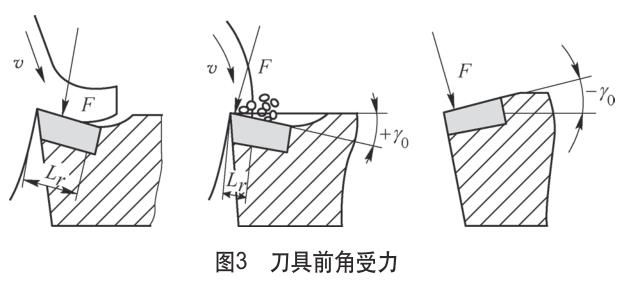 (2)前角角度切削刃的鋒利性和堅固性由前角的大小決定。理論上,正前角可以阻止切屑彈性變形、塑性變形,降低切屑排出時與前刀面的摩擦阻力,有利于散熱和切削。但是,增大前角會使楔角減小,又會使切削刃強(qiáng)度降低、熱量過于集中,容易造成崩刃,刀具耐磨度也下降,刀具前角受力情況如圖3所示。