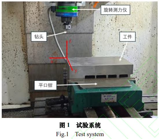 如圖1所示,鉆削試驗在VMC850E立式數控加工中心上進行,選擇TC4鈦合金厚板為鉆削樣件,材料力學性能參數:密度為4400kg/cm3、彈性模量為110GPa、硬度為36HRC、屈服強度為834MPa、拉伸強度為932MPa;樣件尺寸參數:300mm×190mm×130mm。用平口鉗進行裝夾在機床工作臺上,采用奇石樂9123C1011旋轉測力儀測量鉆削過程中的軸向力及扭矩。