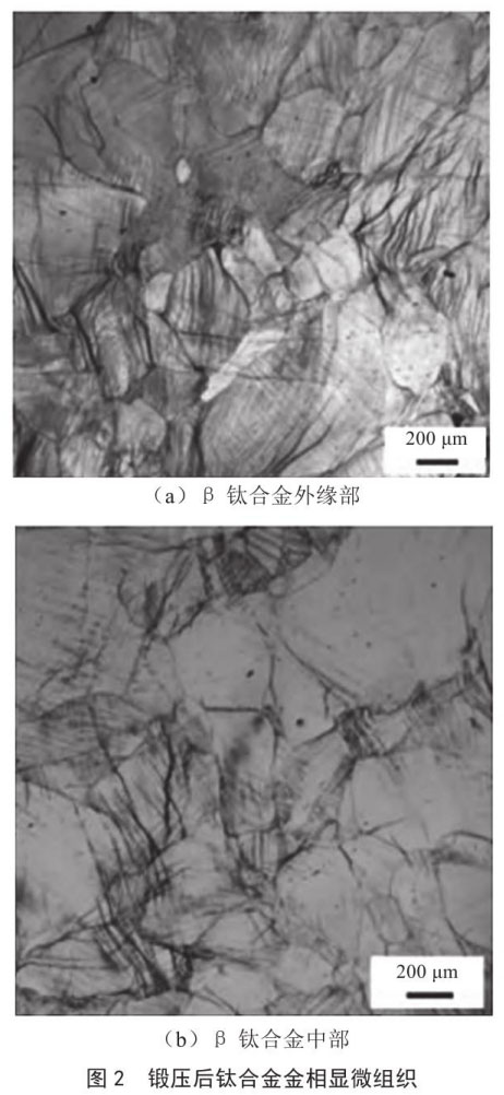 觀察鈦合金經鍛壓后外緣部和中部的金相顯微組織情況,并與鈦合金鑄造金相顯微組織情況進行對比。經過鍛壓處理后,鈦合金內部的原始氣孔缺陷基本消失。金相顯微鏡下的觀察顯示,鍛壓后的鈦合金組織均勻,未見明顯氣孔,表明鍛壓過程有效改善了材料的致密性,消除了鑄造過程中產生的氣孔缺陷。鍛壓后的鈦合金晶粒平均尺寸為 450μm,相較于鍛壓前的粗大晶粒,晶粒尺寸明顯細化,如圖 2 所示 [5]。