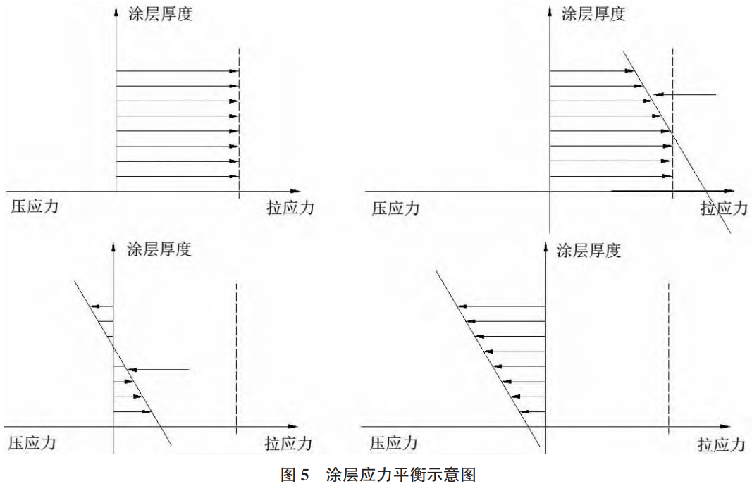 (1) 應力平衡技術。應力平衡技術是在涂層表面用特定的工藝方法改變涂層應力狀態,使涂層表面呈壓應力,涂層整體達到拉應力與壓應力平衡狀態。如圖 5 所示,采用適當的工藝方法,使涂層表面由拉應力狀態向相反方向發生改變,即向壓應力狀態發生變化。隨著作用力度的增加,涂層整體可呈現三種不同狀態。